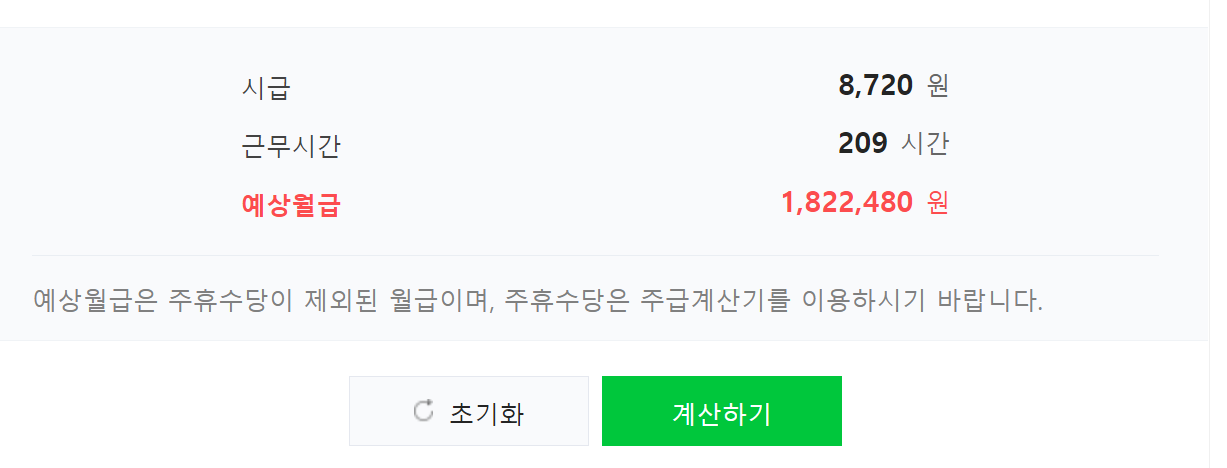 일단 일주일은 하루 52시간 최장으로 일을 할수가 있습니다. 그리고 주휴시간을 포함하여 최장 209시간을 일할수가 있습니다. 그러면 급여계산 해보는 곳을 알려드릴께요.