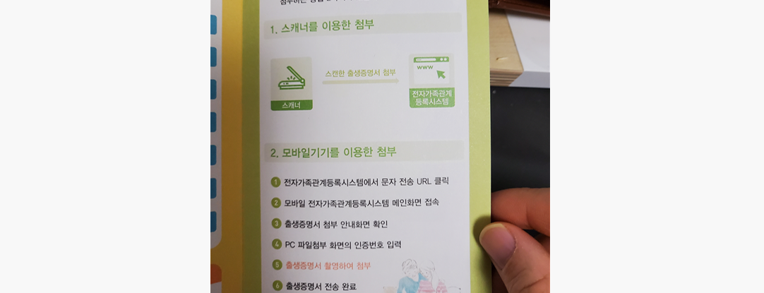 스캐너를 이용한 첨부 방법 스캐너를 이용한 첨부 방법이 있고 모바일 기기를 이용한 첨부가 있습니다. 일단 전자 가족관계 등록시스템에 문자 url전송을 클릭 이후 메인화면 접속 그리고 출생증명서 첨부 안내 화면 확인 이후에 인증번호 입력하시고 촬영하시면 전송이 완료가 됩니다.