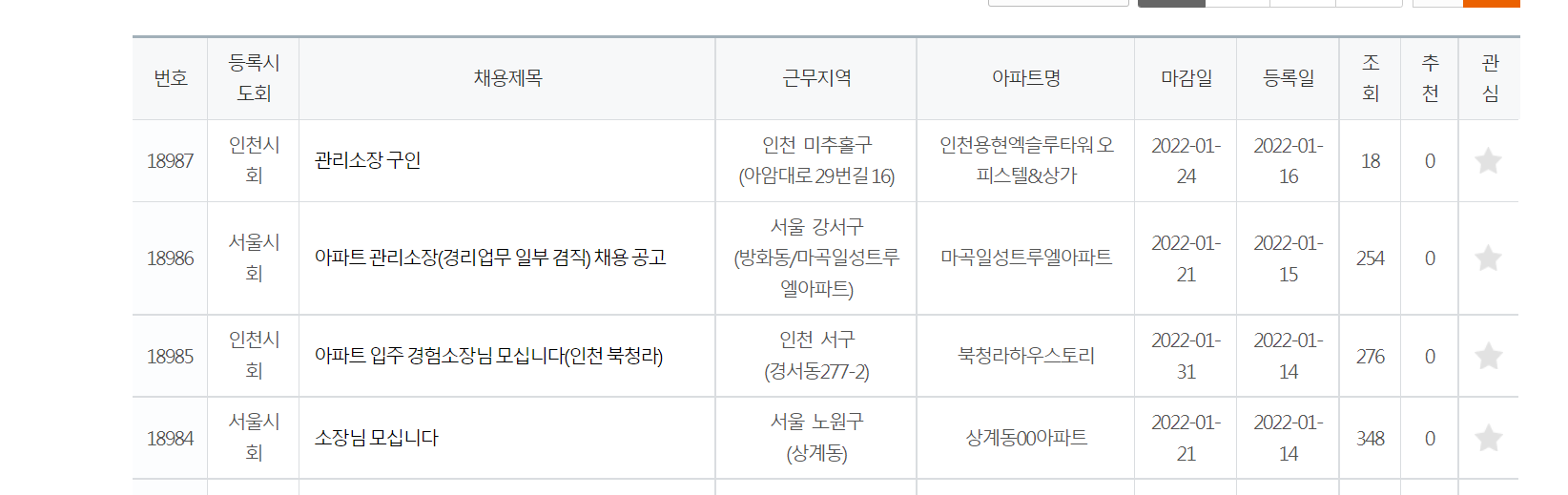 채용제목 부분에 보면 아파트 관리소장등도 보고 알수가 있드라구요.