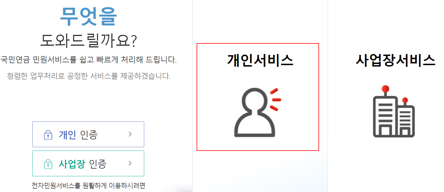 전자민원 메뉴에 보면 개인민원을 선택하여 주면 됩니다. 그리고 무엇을 도와드릴까요? 부분에 국민연금 민원서비스를 쉽고 빠르게 처리해 드린다고 하는 부분이 있죠. 여기서 바로 옆 개인서비스를 선택하여 줍니다.
