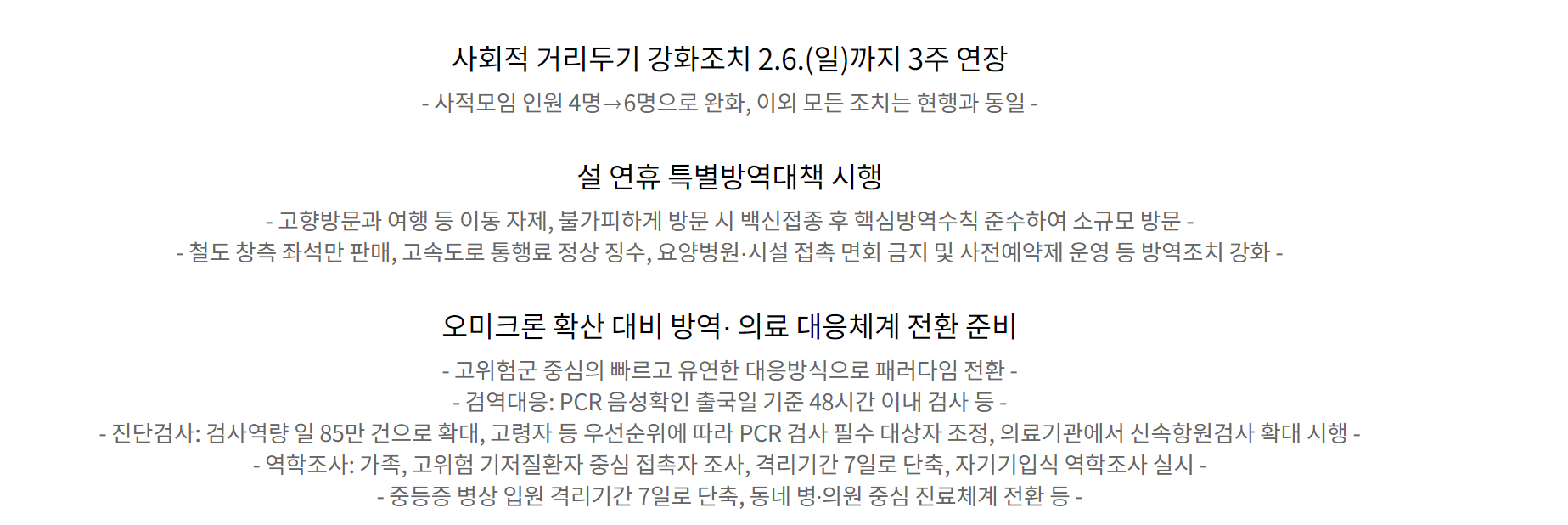 이번 코로나 중에서도 오미크론이 확산되면서 정부는 사회적 거리두기를 연장하며 강화 조치를 2.6일까지 지속하게 되는데요. 사적 모임은 6명으로 하며 나머지는 동일하게 됩니다. 특히 설 연휴 특별방역 대책으로 시행하게 되는데요. 일단 철도의 경우 창 측만 고속도로 통행료 정상 징수, 요양병원 등 각종 시설 사전예약 등등으로 시행이 됩니다.