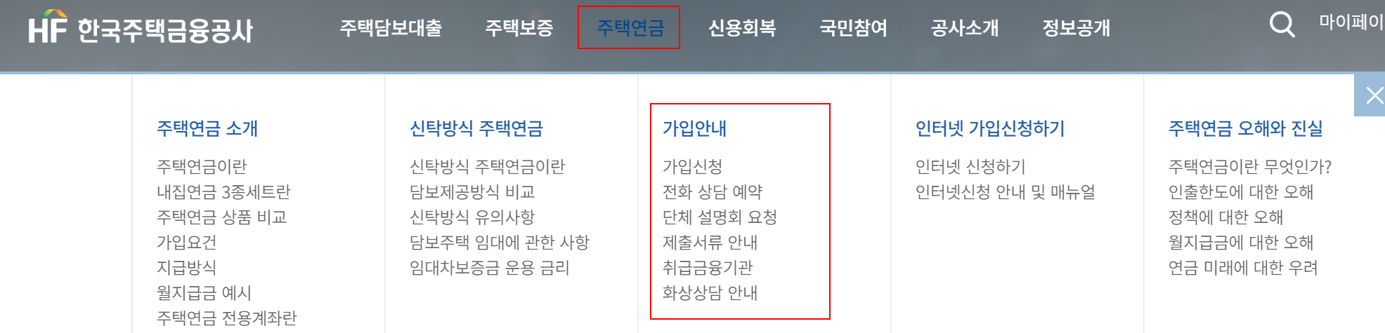 신청은 한국주택금융공사에서 하는 곳이기 때문입니다. 가입안내 부분에 보시면 신청란이 보이시고 이쪽으로 가시면 됩니다.