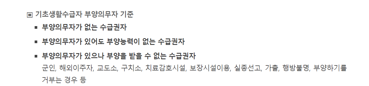 특히나 부양의무자 자격요건을 먼저 말씀을 드려볼까 합니다. 기초 적으로 부양의무자가 없는 수급권자 및 그리고 부양능력이 없는 수급권자 그리고 각종 군인, 이주자, 구치소 등등 각종 아래 사진에 따른 조건에 해당하는 자들 입니다.
