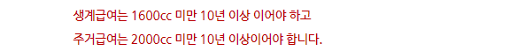 기초생활수급자 생계급여, 및 주거급여 에 따른 각종 cc에 따른 부분이 있습니다. 1600cc 미만 10년 이상 이어야 합니다. 그리고 주거급여의 경우는 2000cc 미만 그리고 10년 이상인 차들이어야 합니다. 즉 왠만한 새차를 가지고 있다면 절대적으로 있으면 안됩니다.
