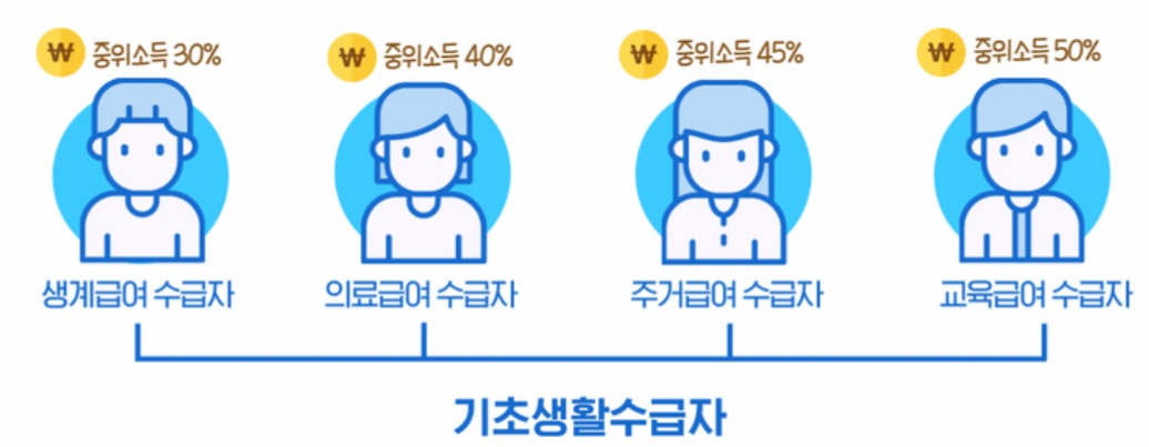특히나 기초생활 수급자 요건중에서 생계급여, 의료급여, 주거급여, 교육급여는 소득에 따른 분류에 따라서 지원 받을 월급 가격이 달라지게 됩니다.